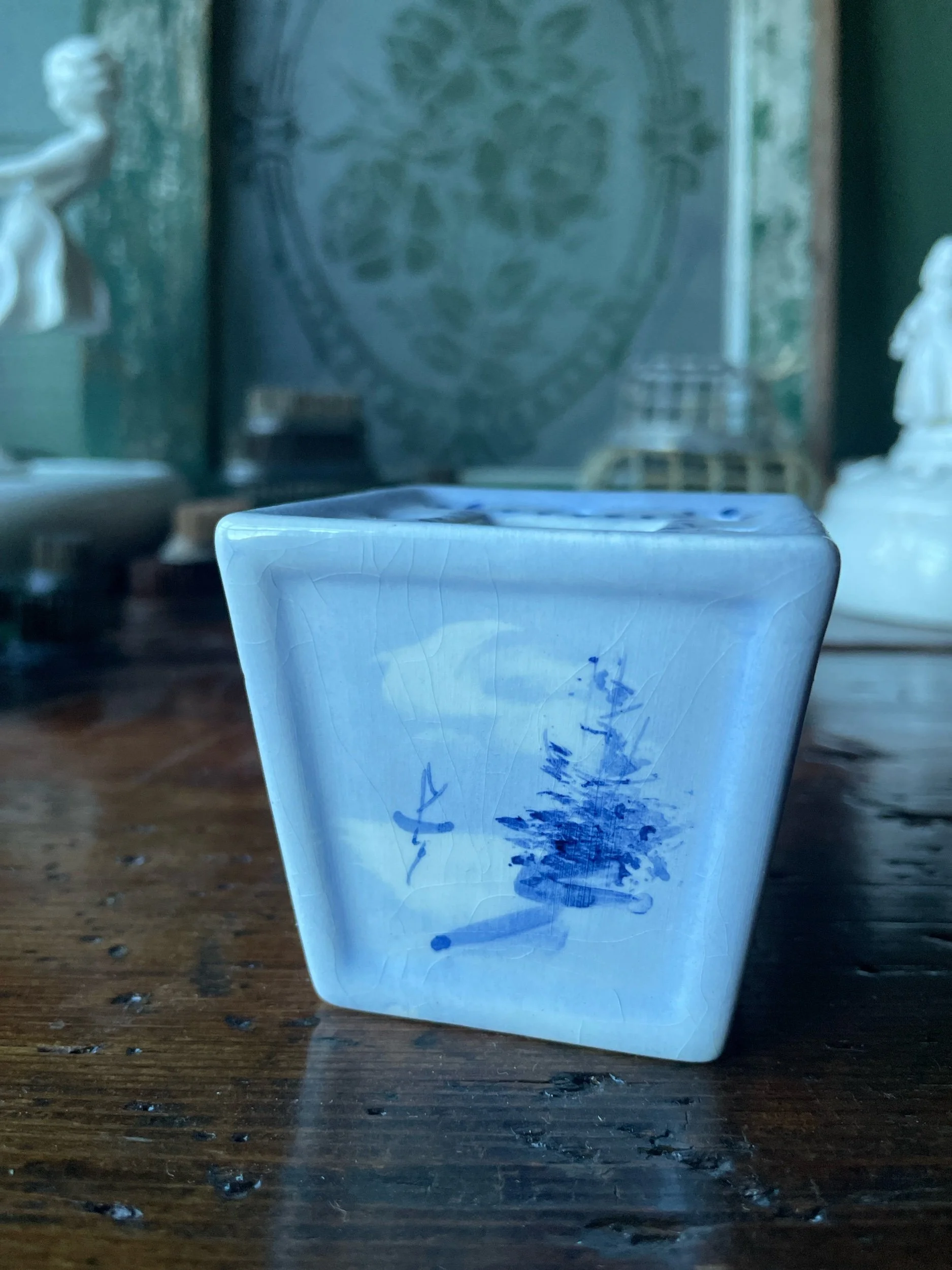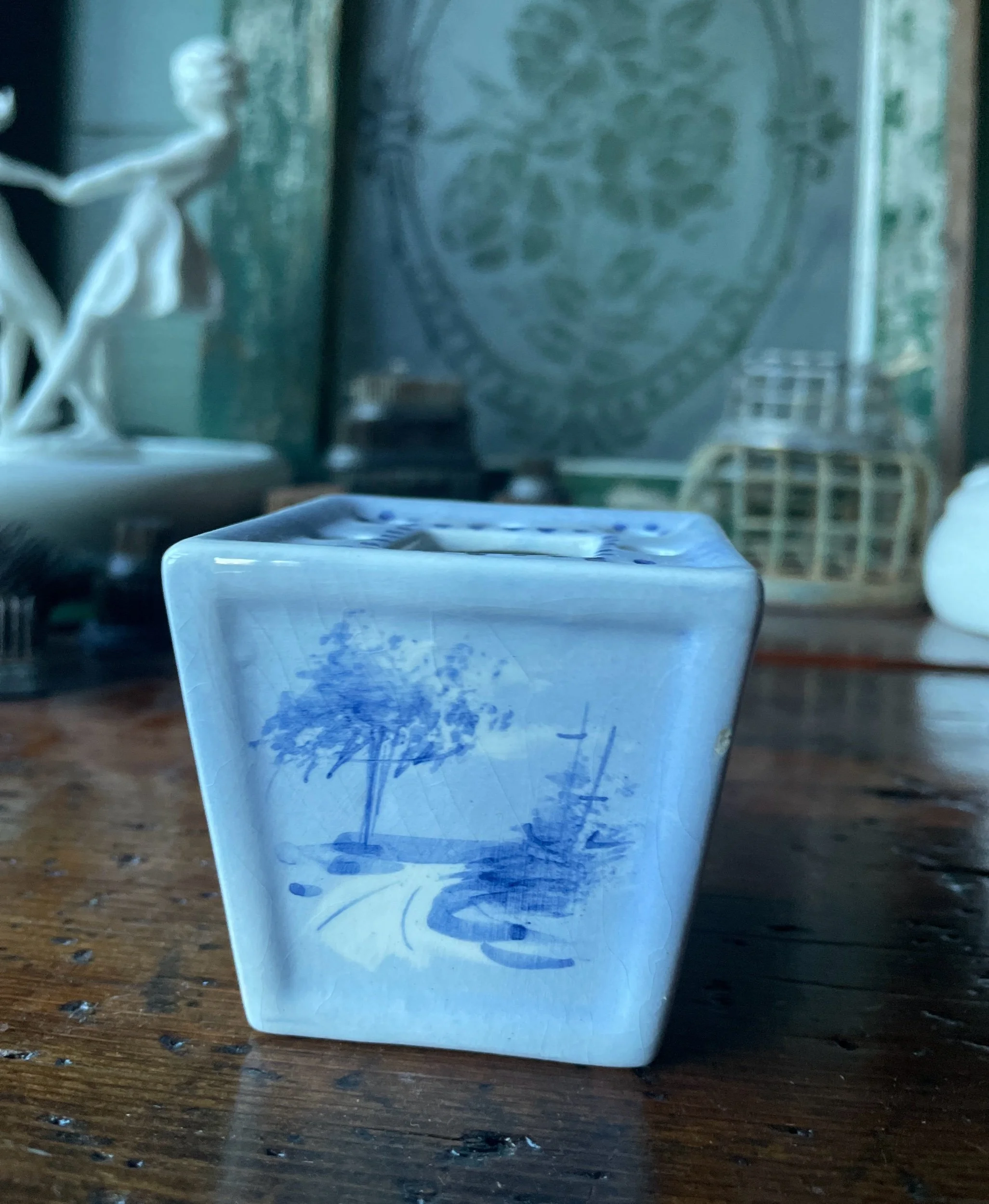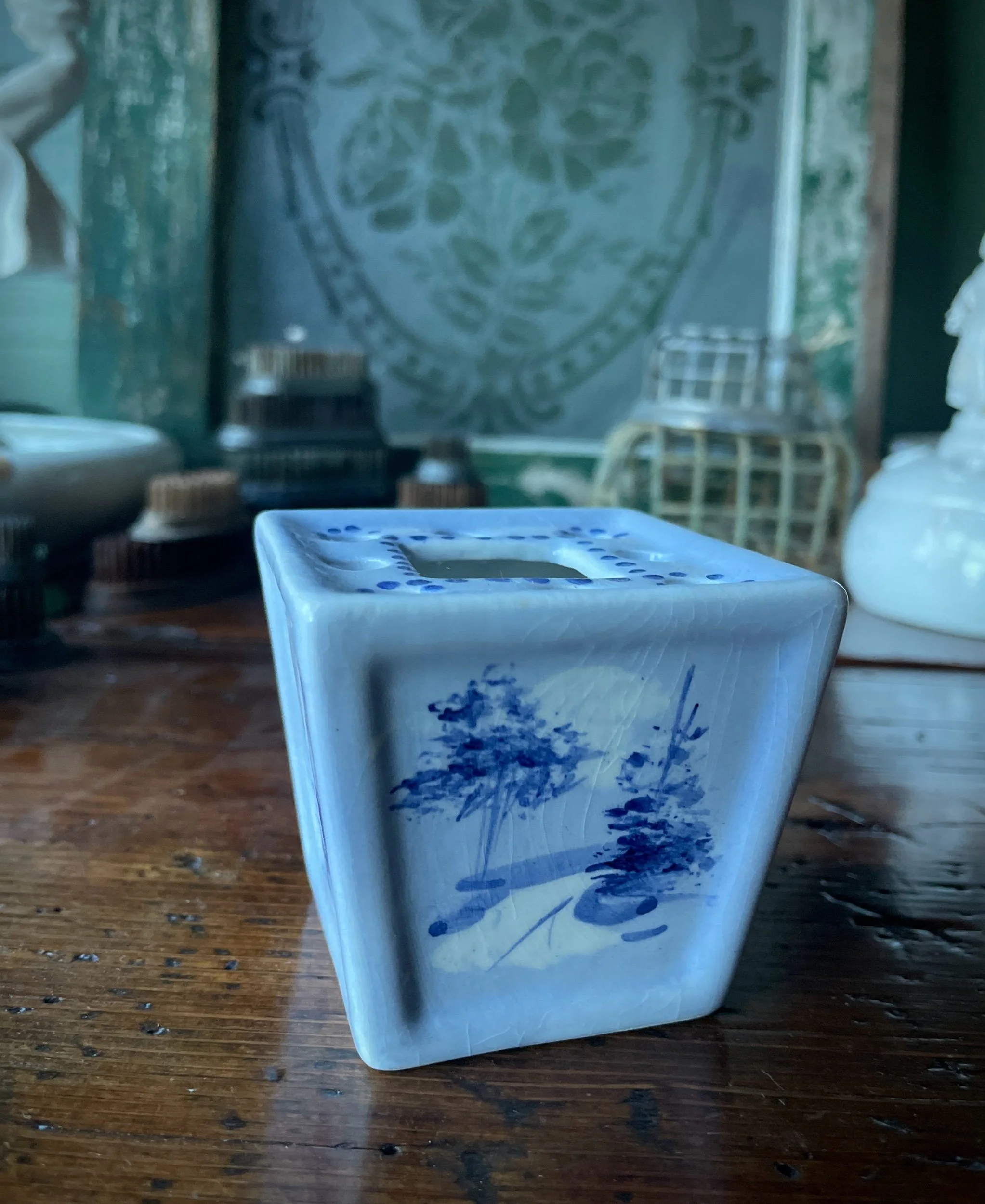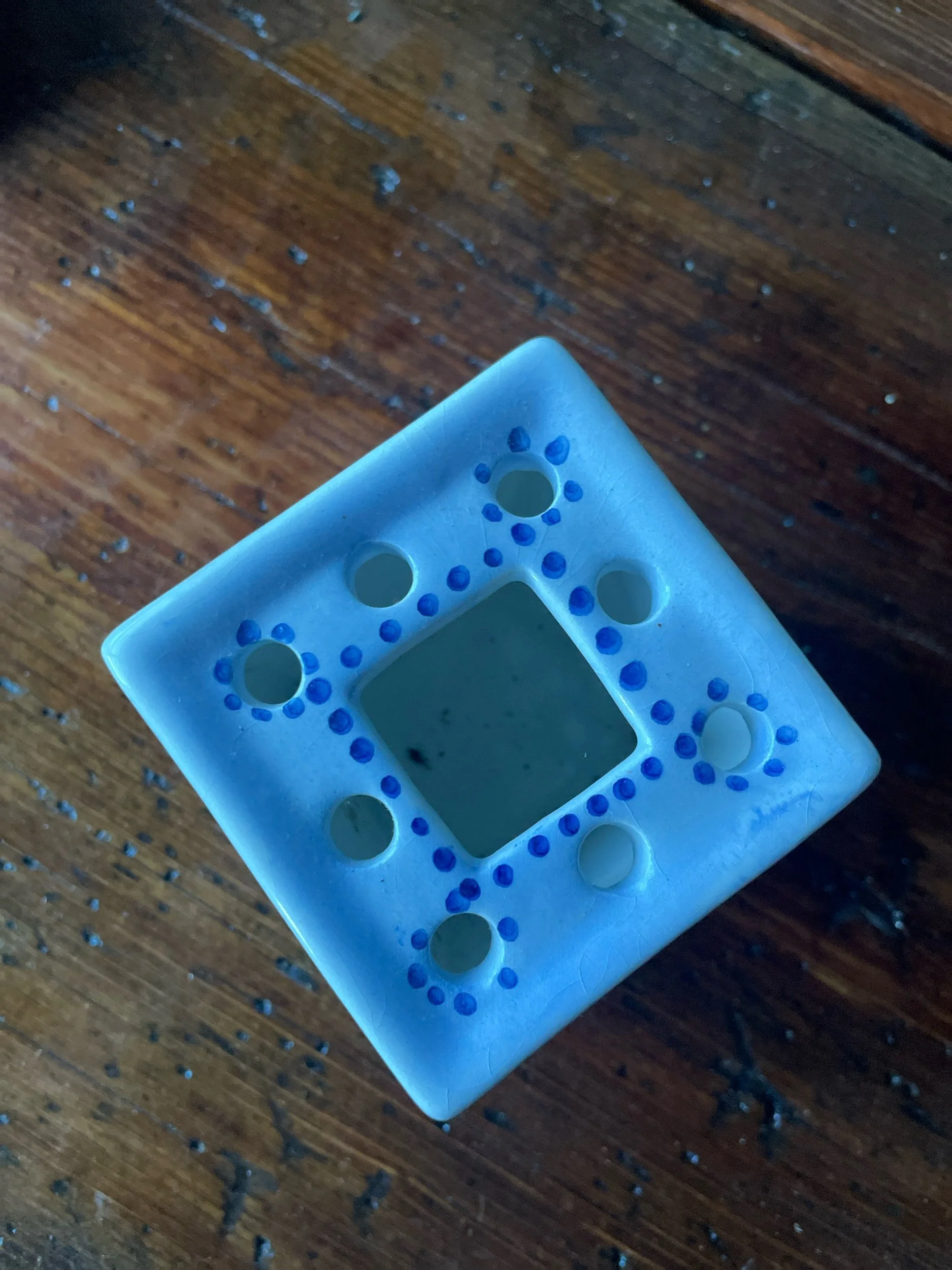 This cute little vintage flower frog is just 2.5” tall and square but makes the sweetest vessel to hold a few precious blooms. Markings on the bottom indicate it was made in Portugal. The perfect addition to a vintage frog collection!