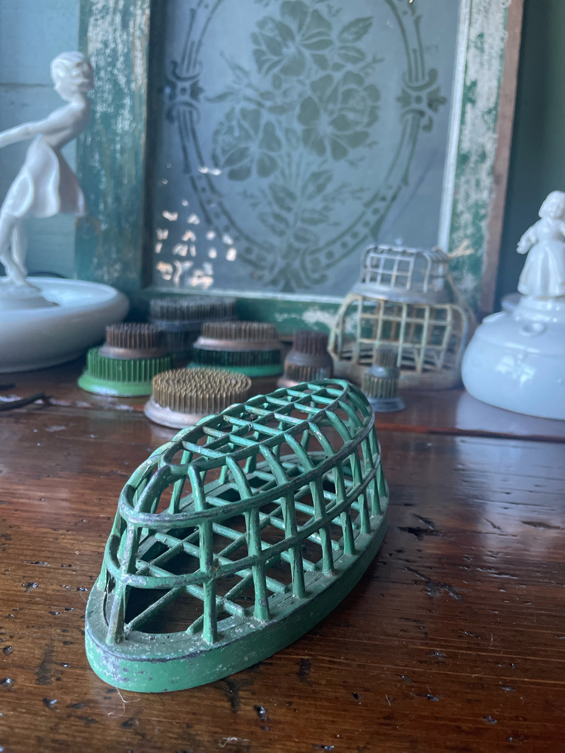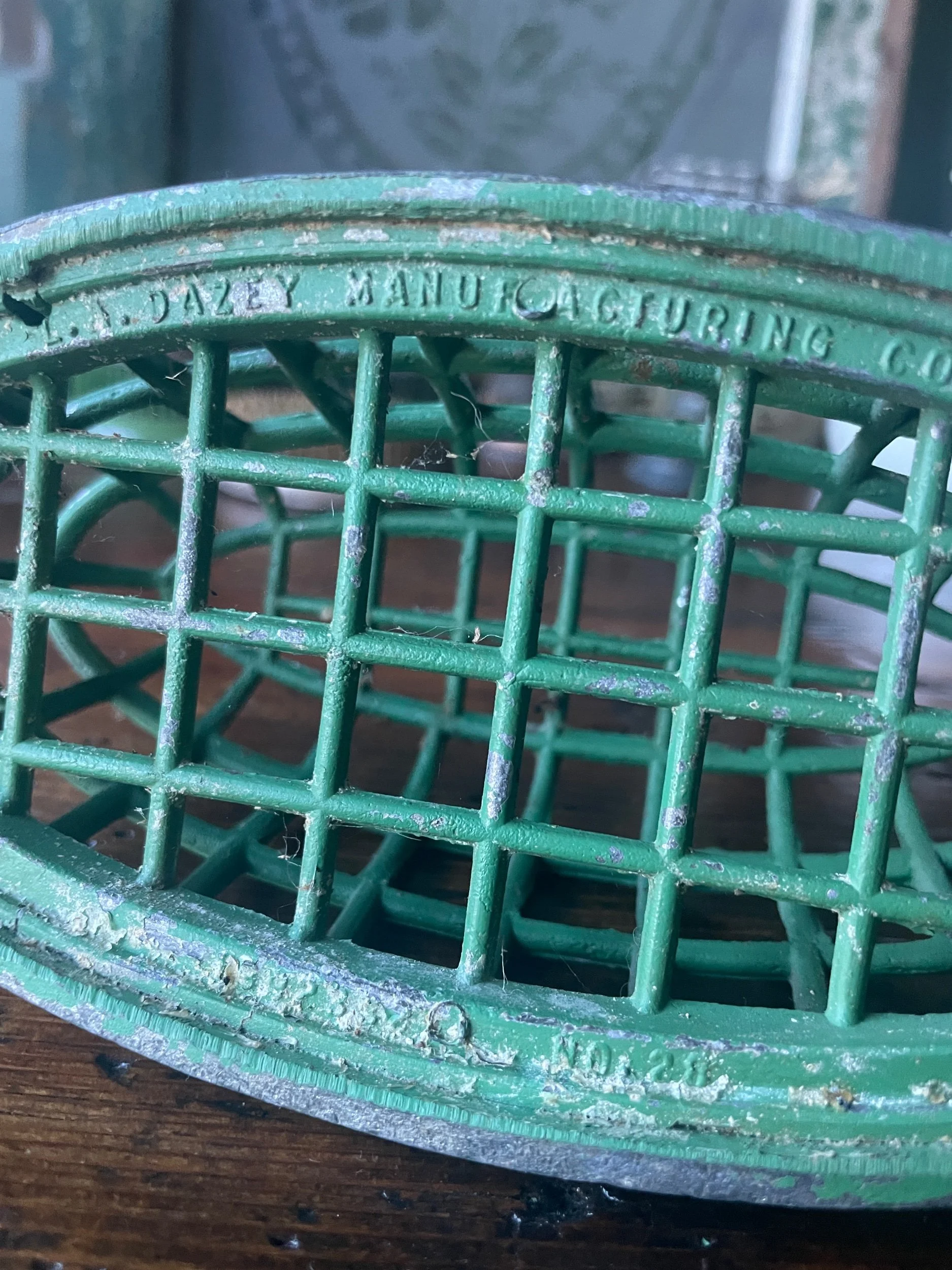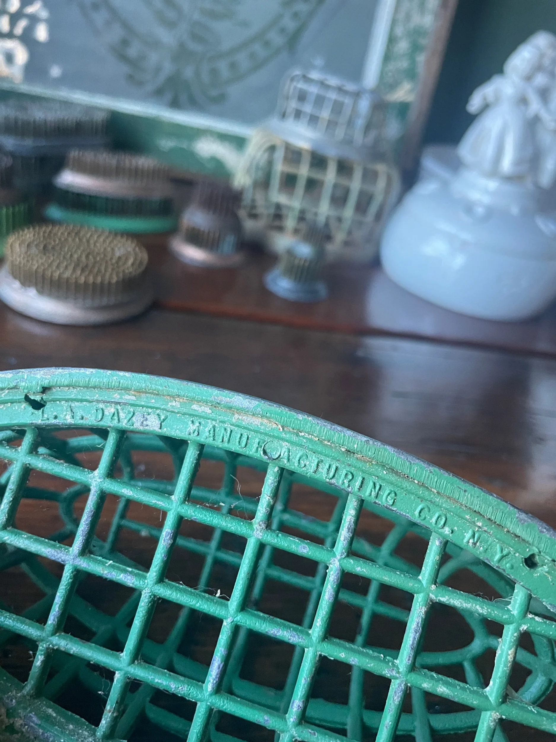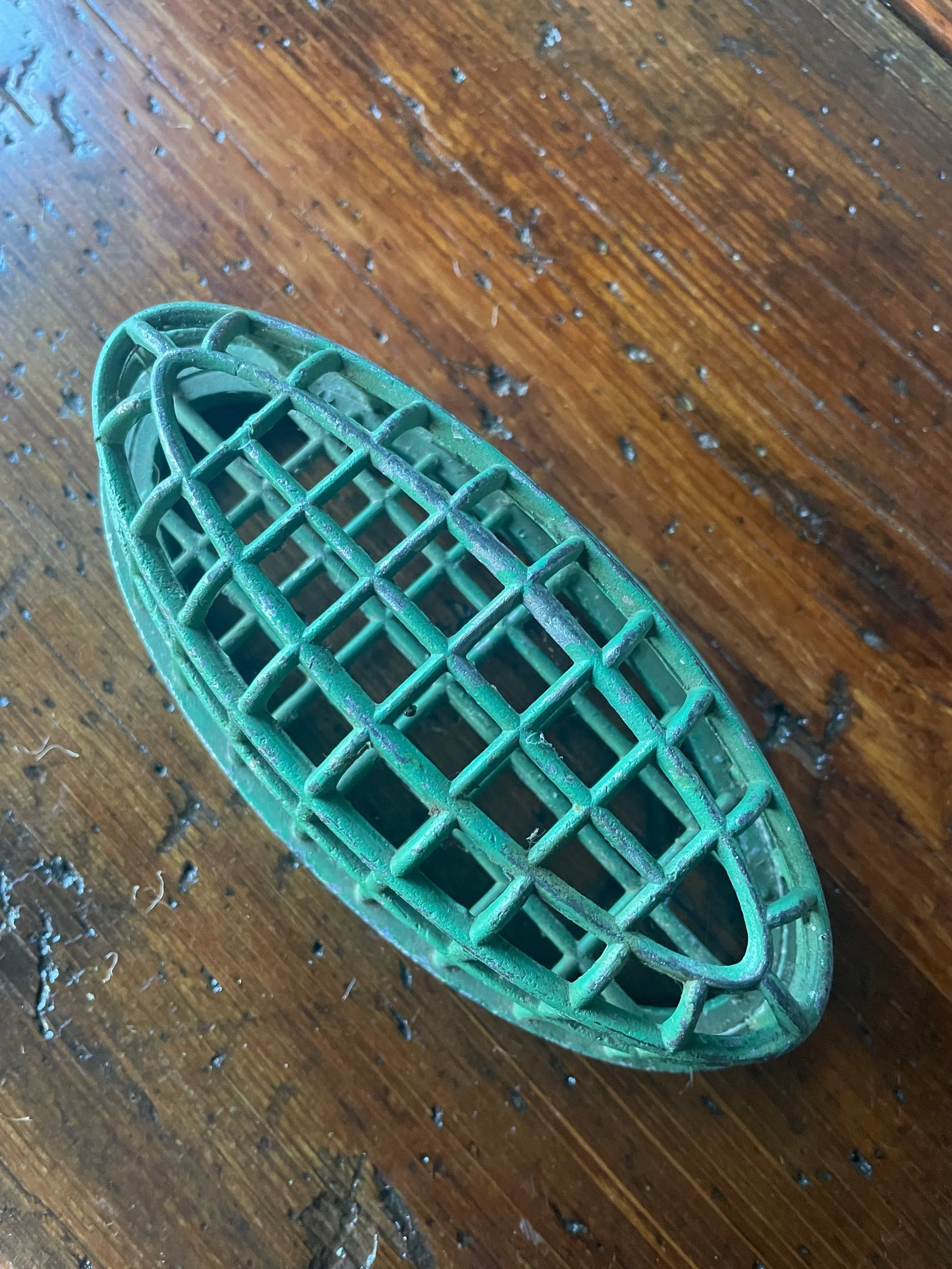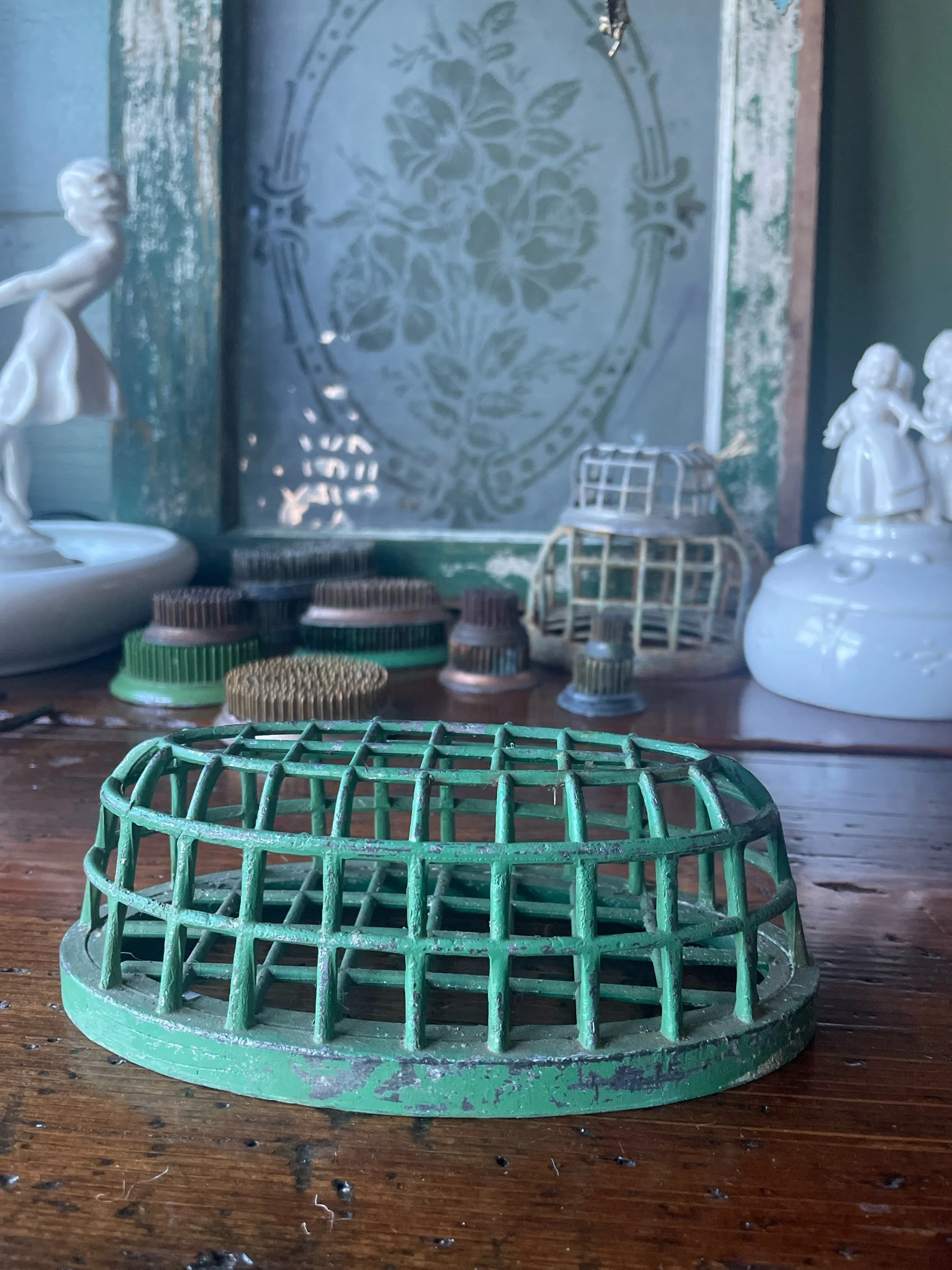 This large flower frog will work great for your larger arrangements. It’s also a perfect display piece for a collection of pens, your paint brushes or a few special marbles! It measures 6.5” long, 3.25” wide and 2.5” tall. DAZEY markings on the bottom.