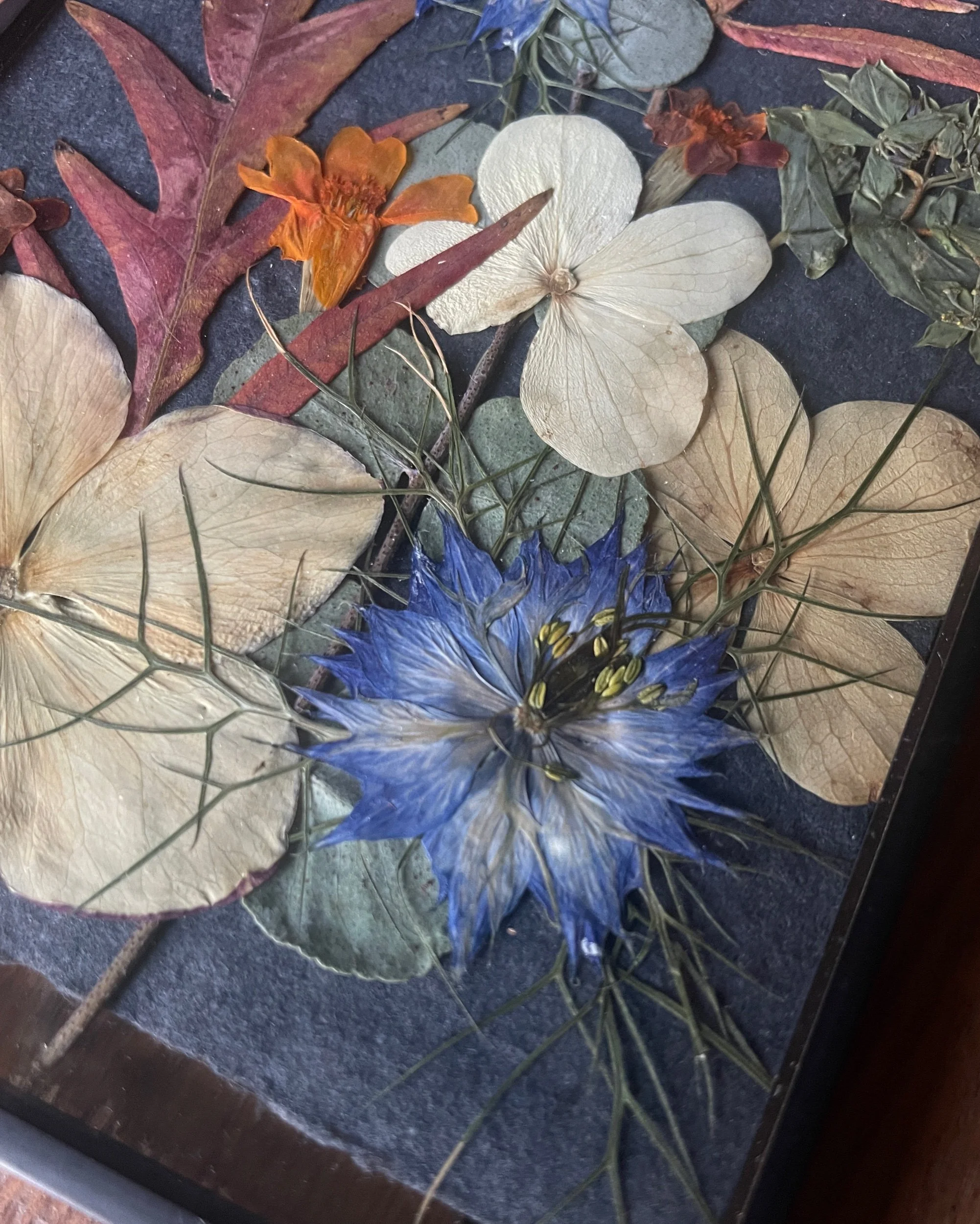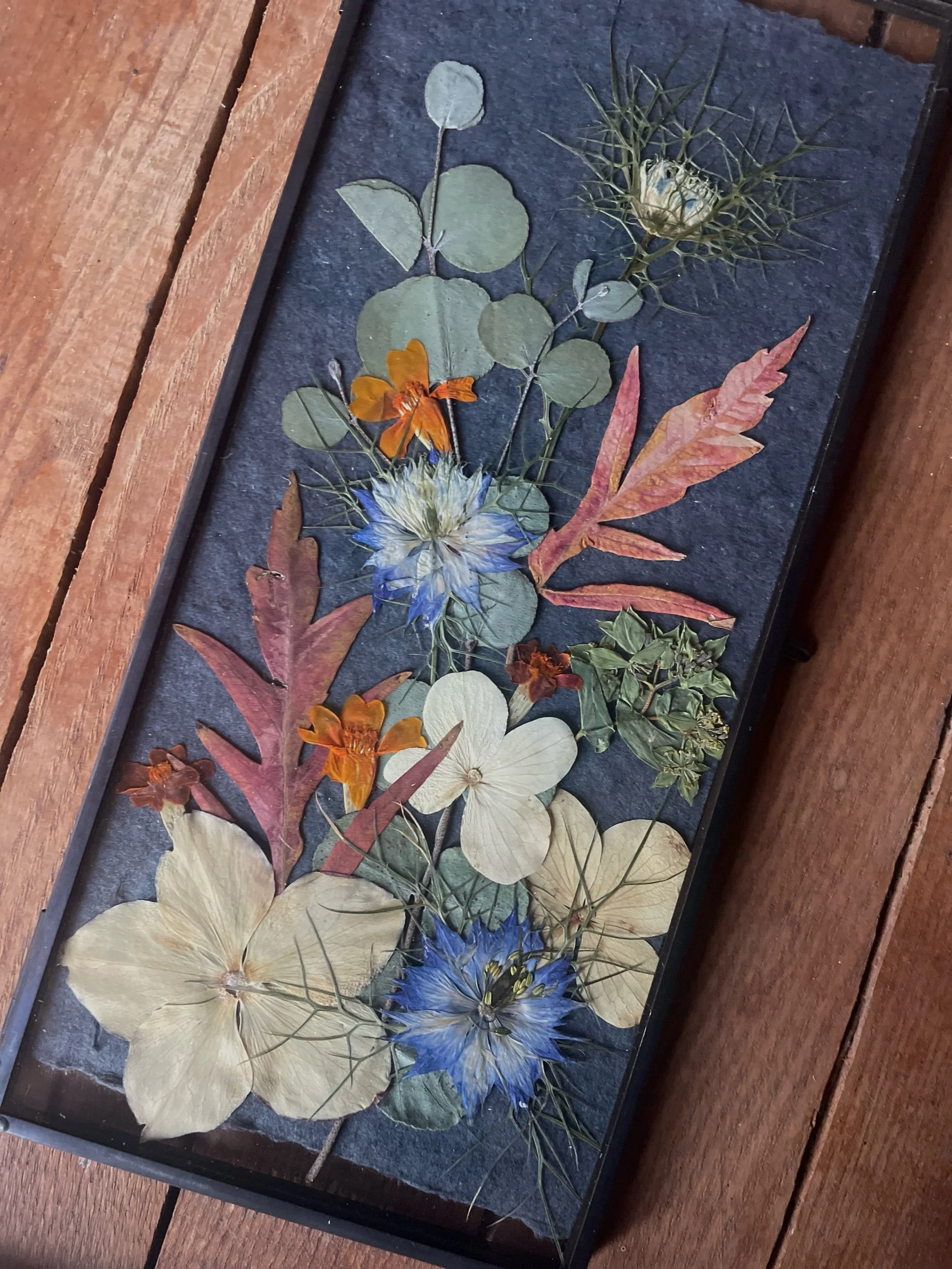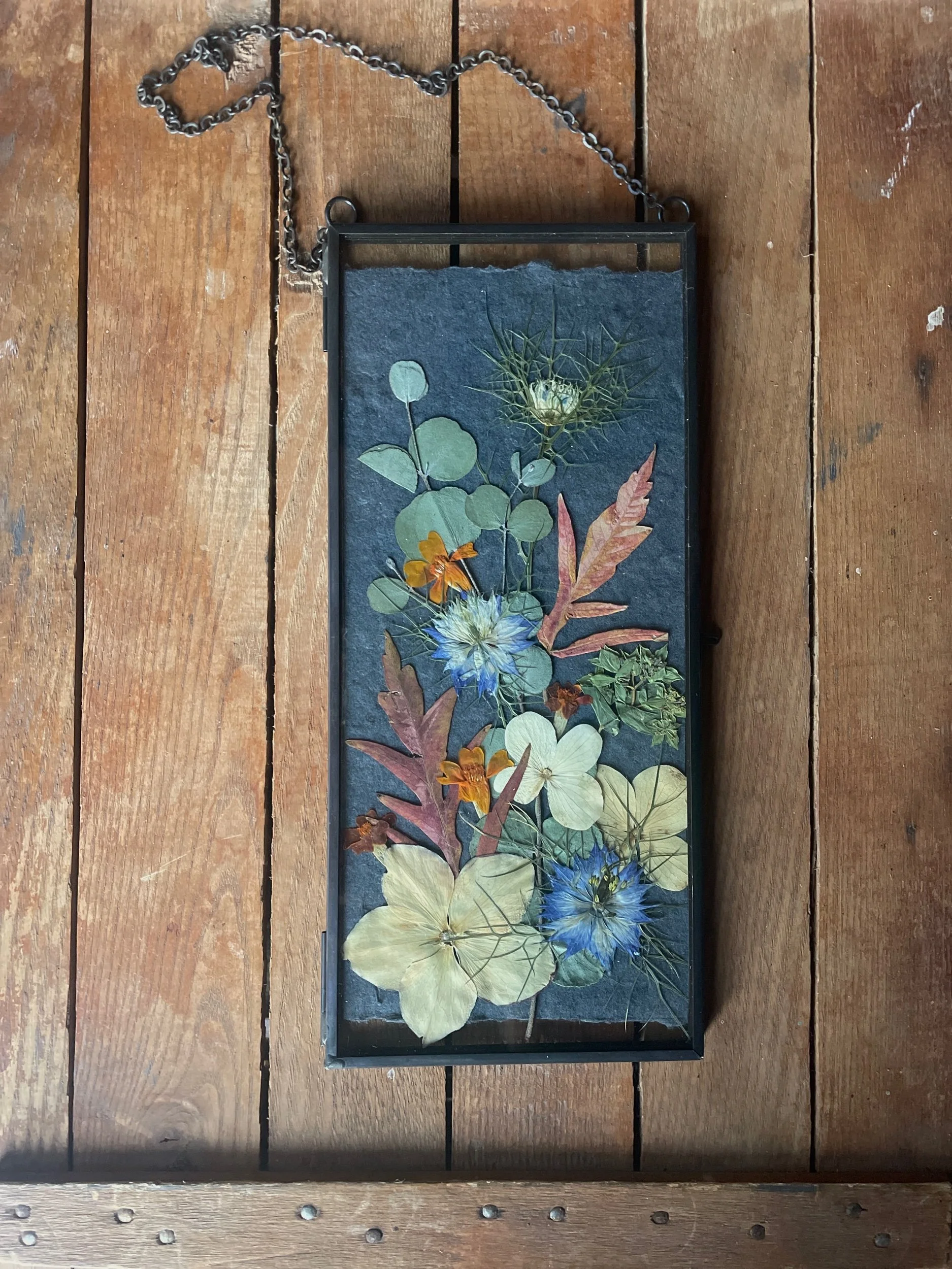 A beautiful mix of pressed flowers and foliage mounted on handcrafted paper make this a charming piece. The double glass, metal frame measures 4” wide by 9” long. The overall length including the chain for hanging is 16”.