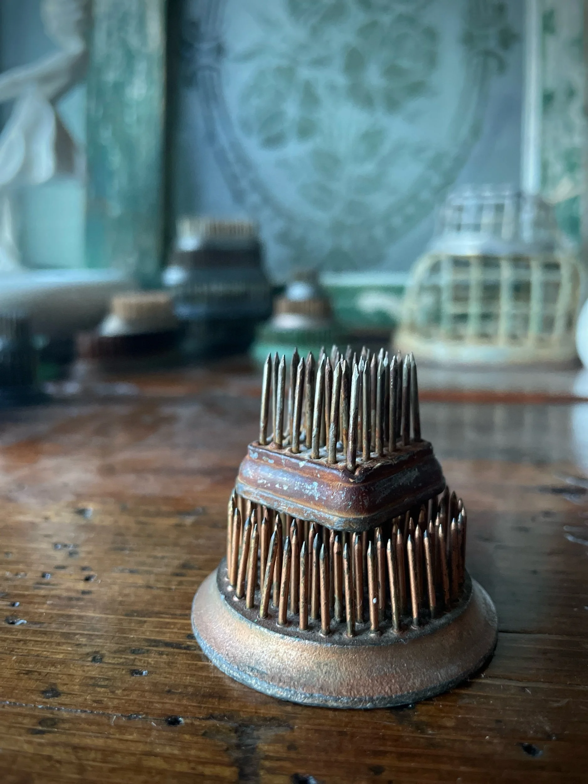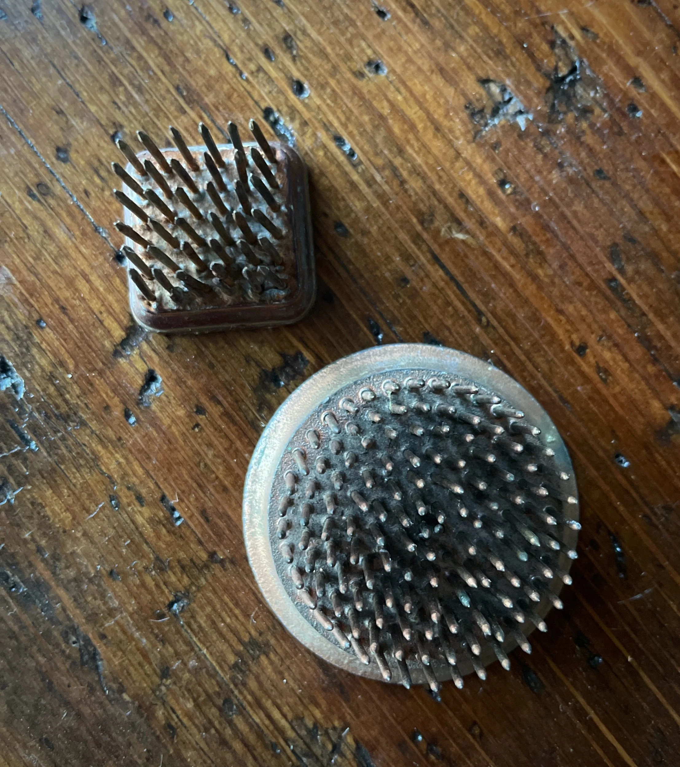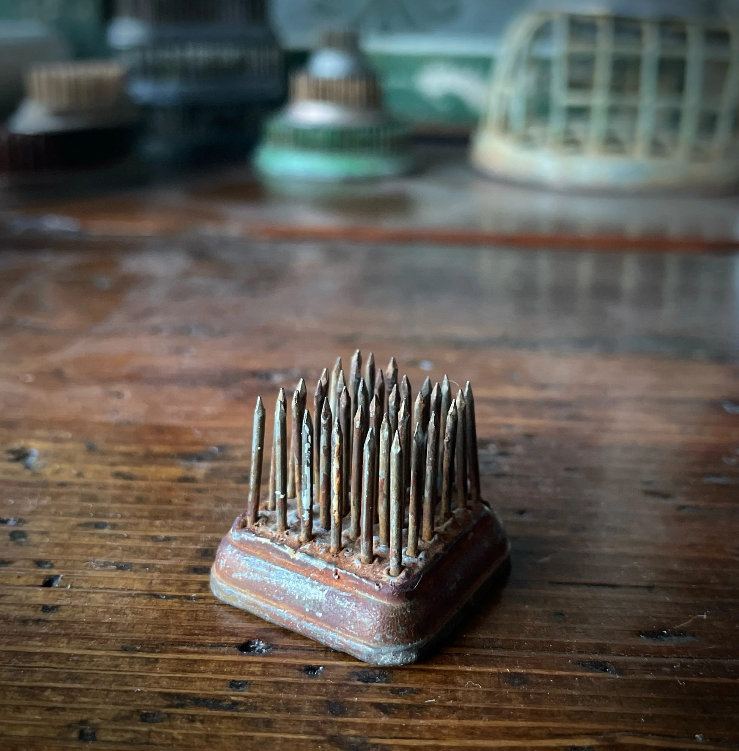 This set of vintage flower frogs is perfect for adding to your flower arranging toolbox, to use for displaying pictures or just to add to your frog collection. The square measures 1” in all directions and the round is 1 7/8ths inches round and .75” tall. There are no brand markings on the bottoms.