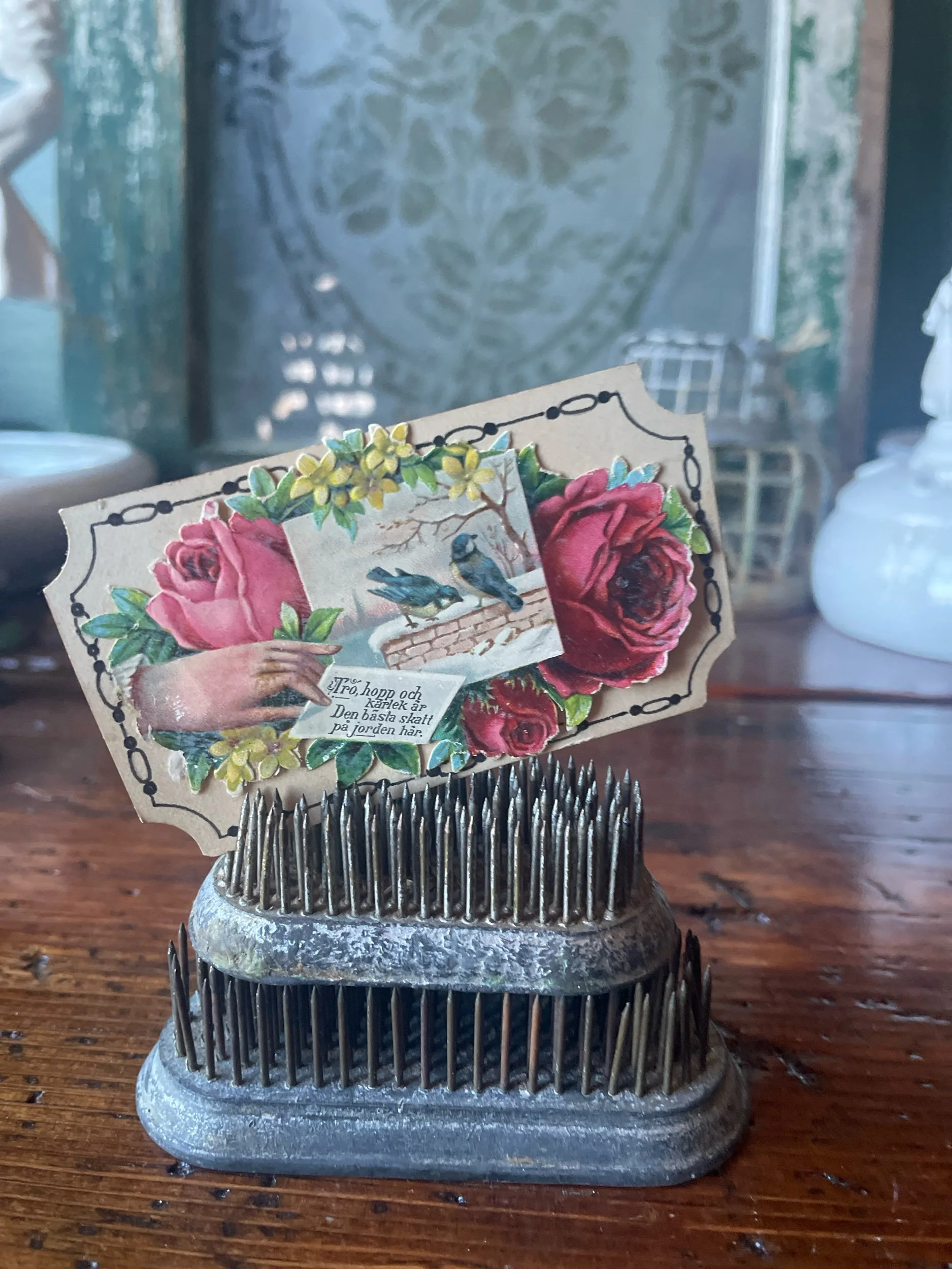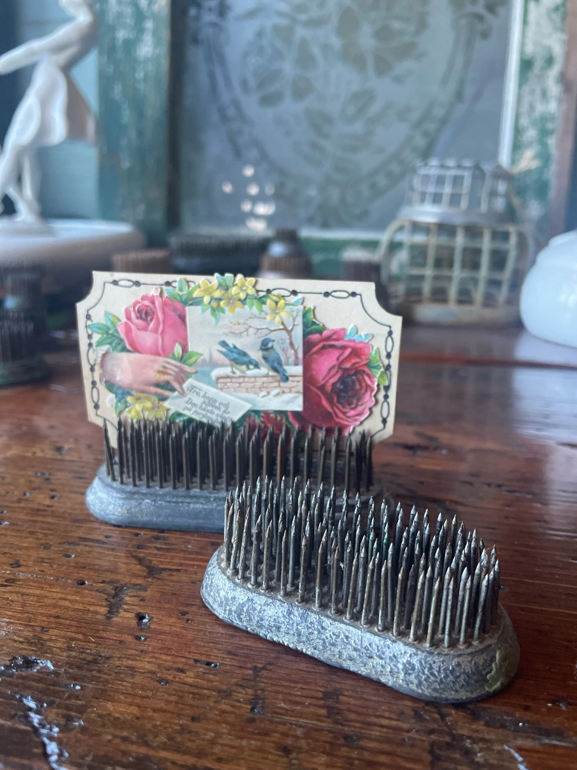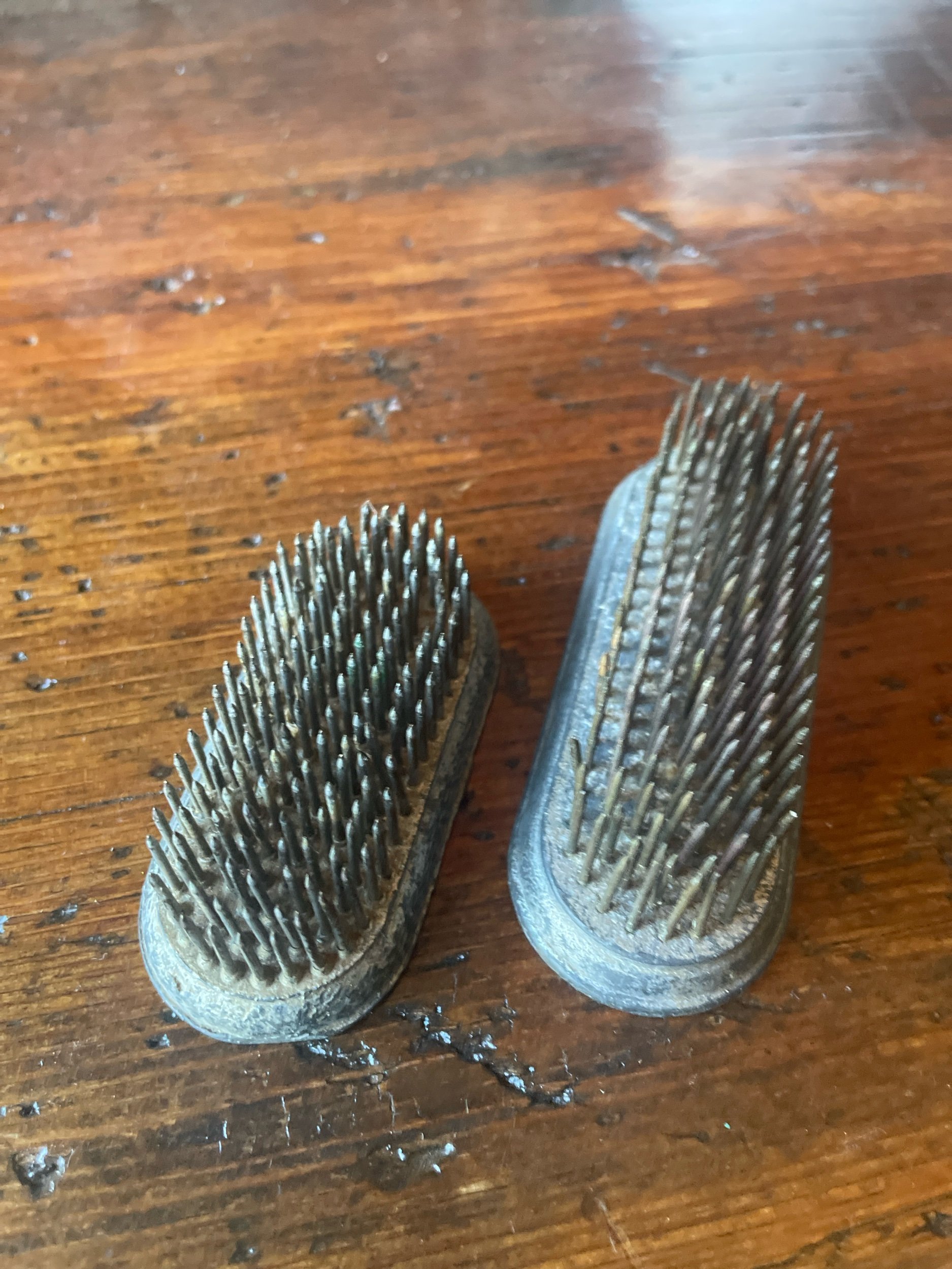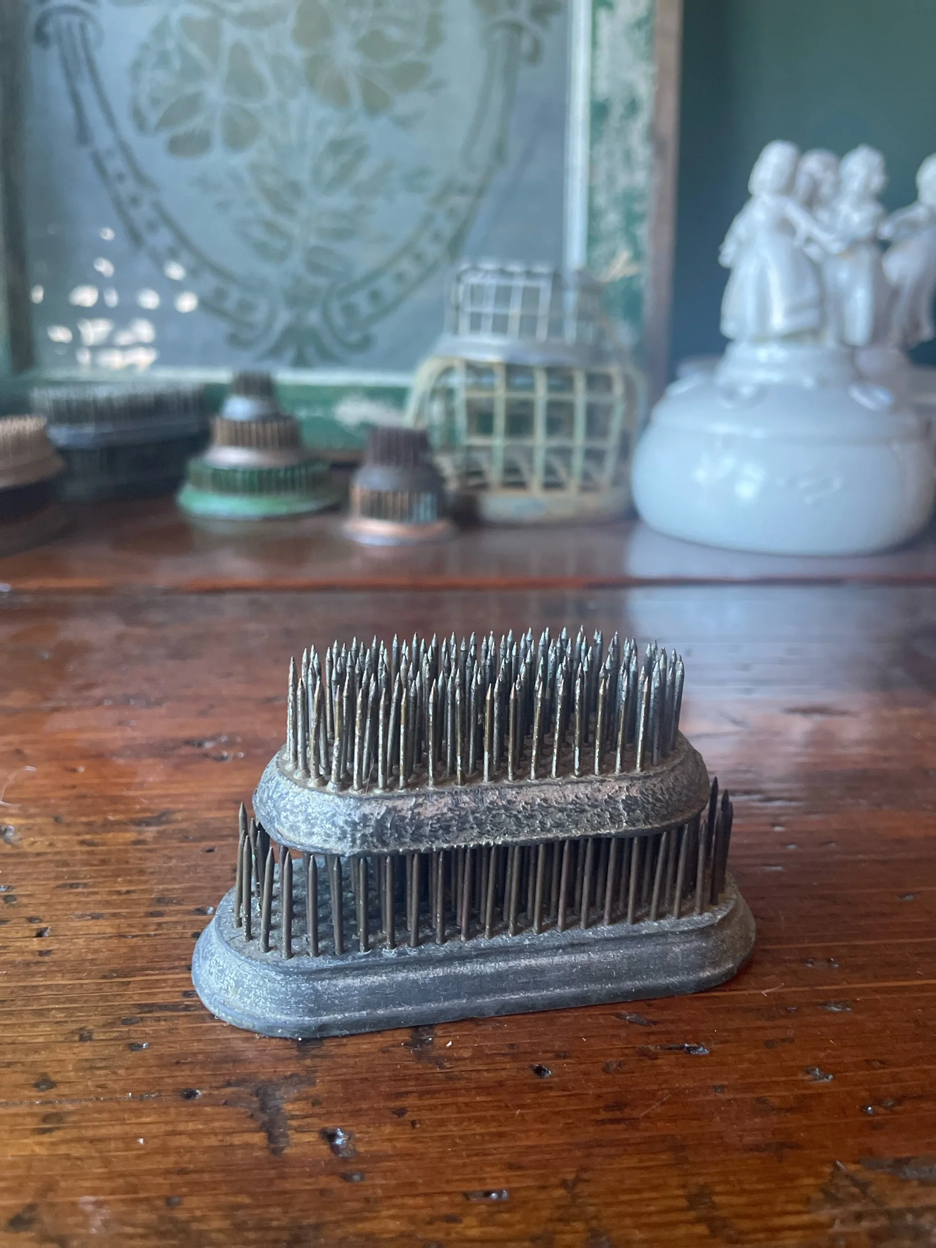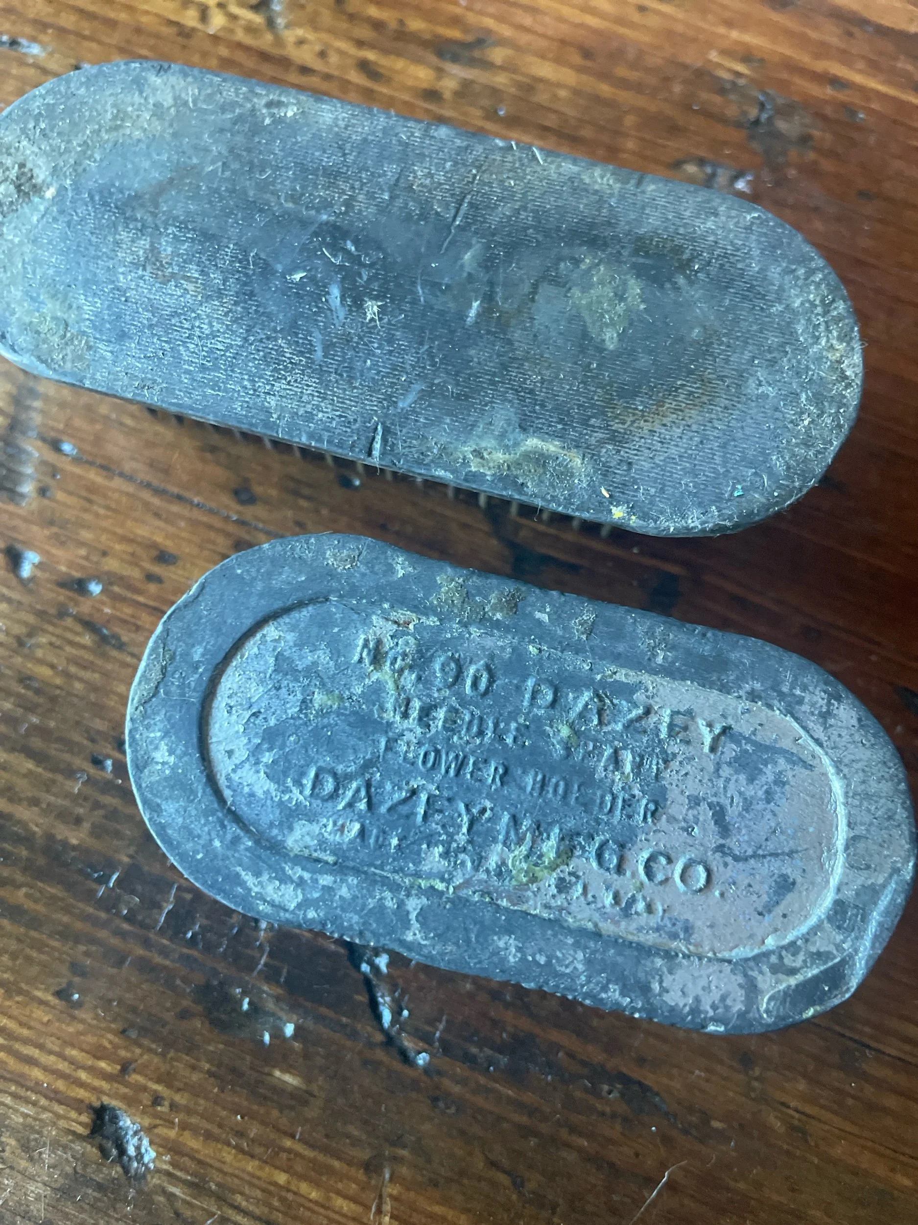 These pin type vintage frogs are equally valuable for floral design or just to add to your collection. Smaller one has the DAZEY markings on it. The smaller one is 2.75x1.25 and .75 tall and the larger is 3.5x1.5 and 1” tall.