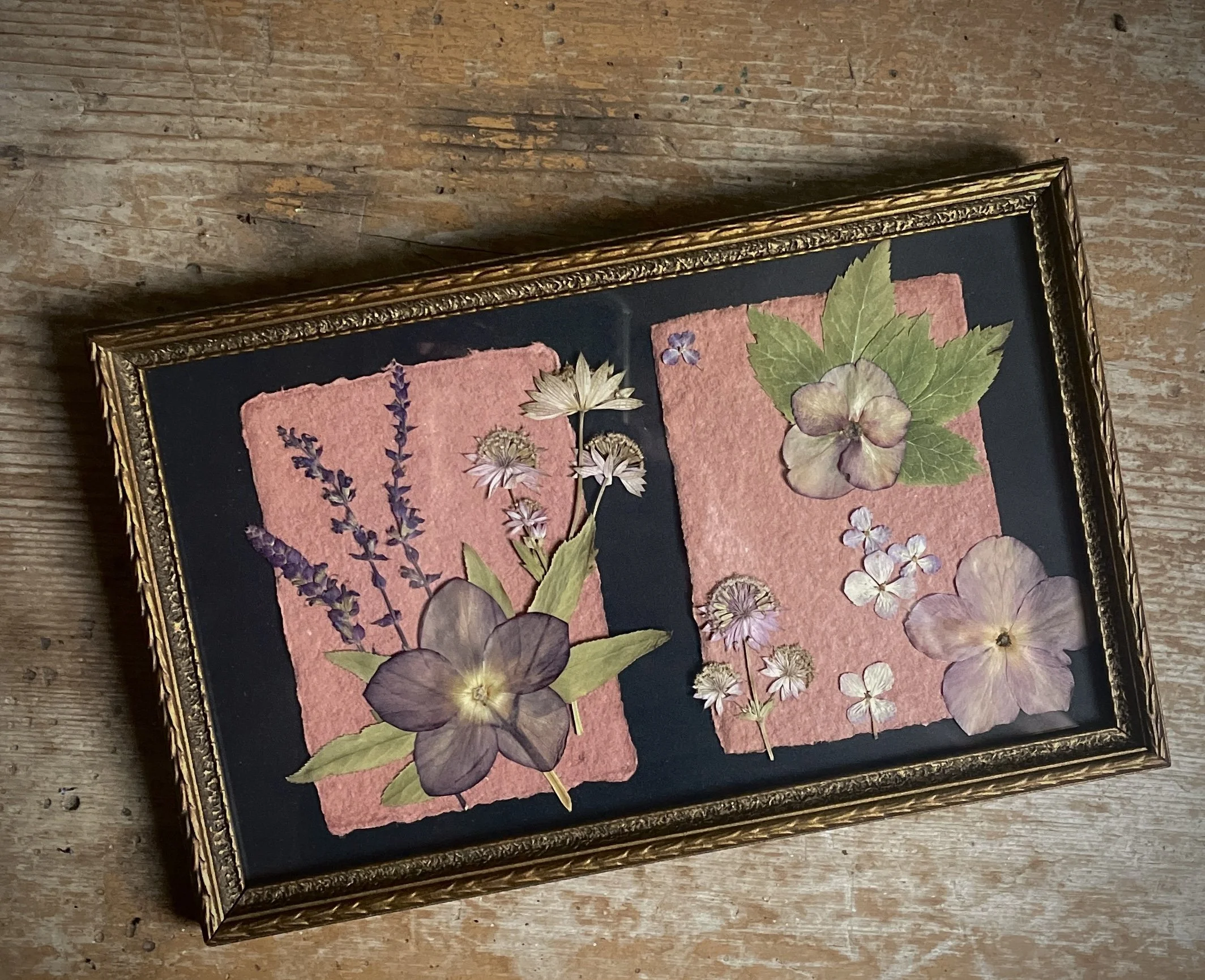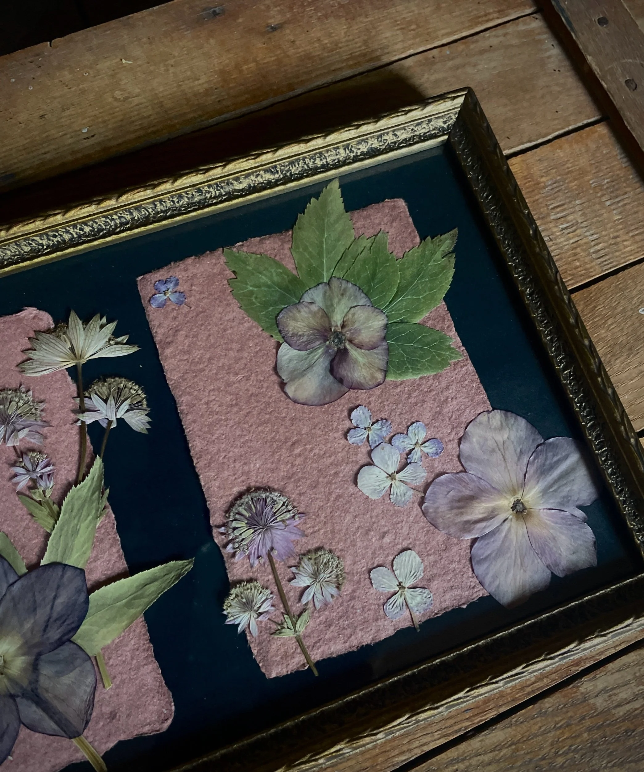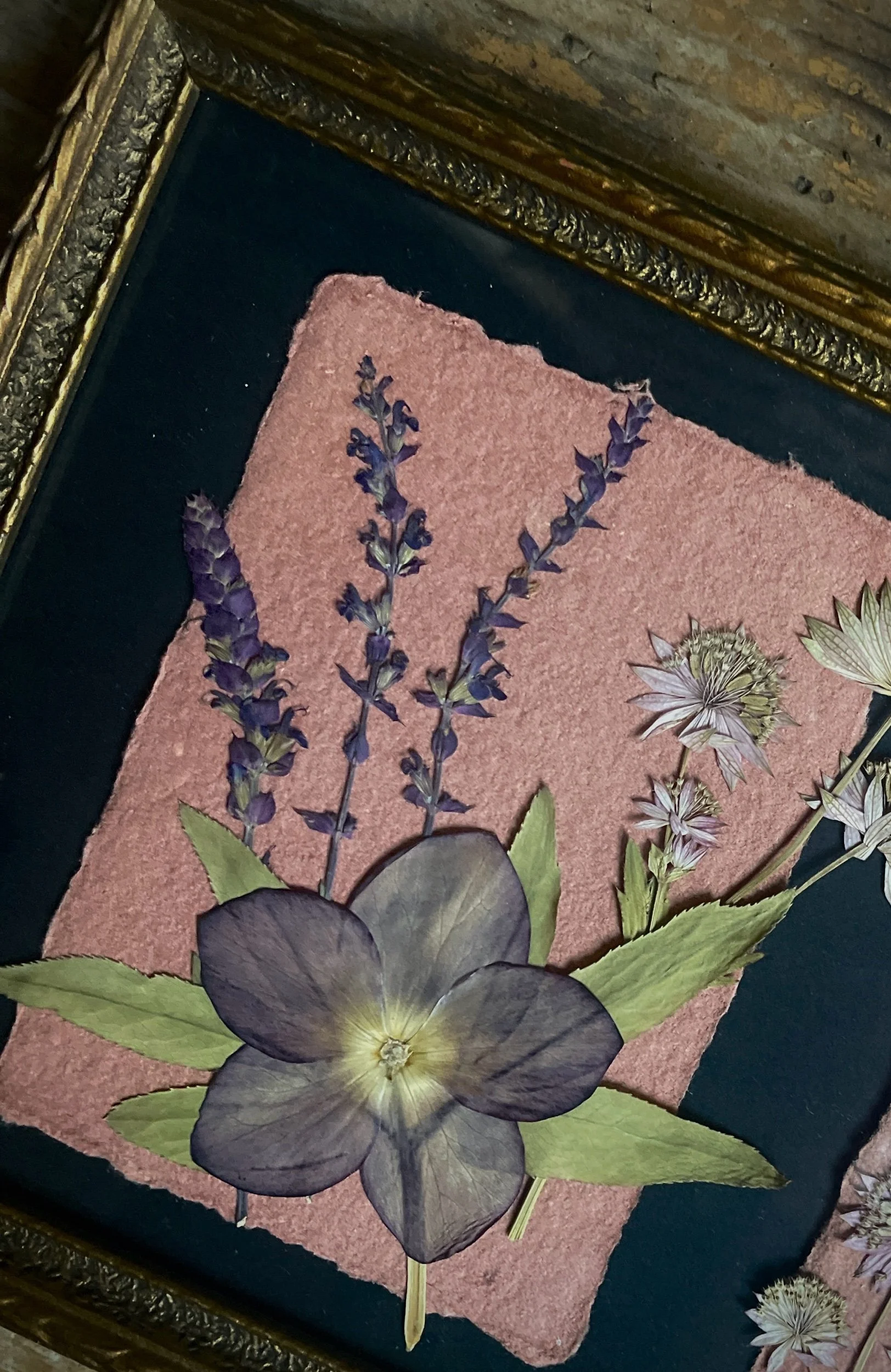Featuring hellebores, salvia, and astrantia, this piece brings back memories of a spring garden. Each of our pressed flower pieces is crafted from flowers grown and pressed here at our flower farm. This piece is finished off with a vintage wood frame and measures 10.5” wide by 6.5” tall.