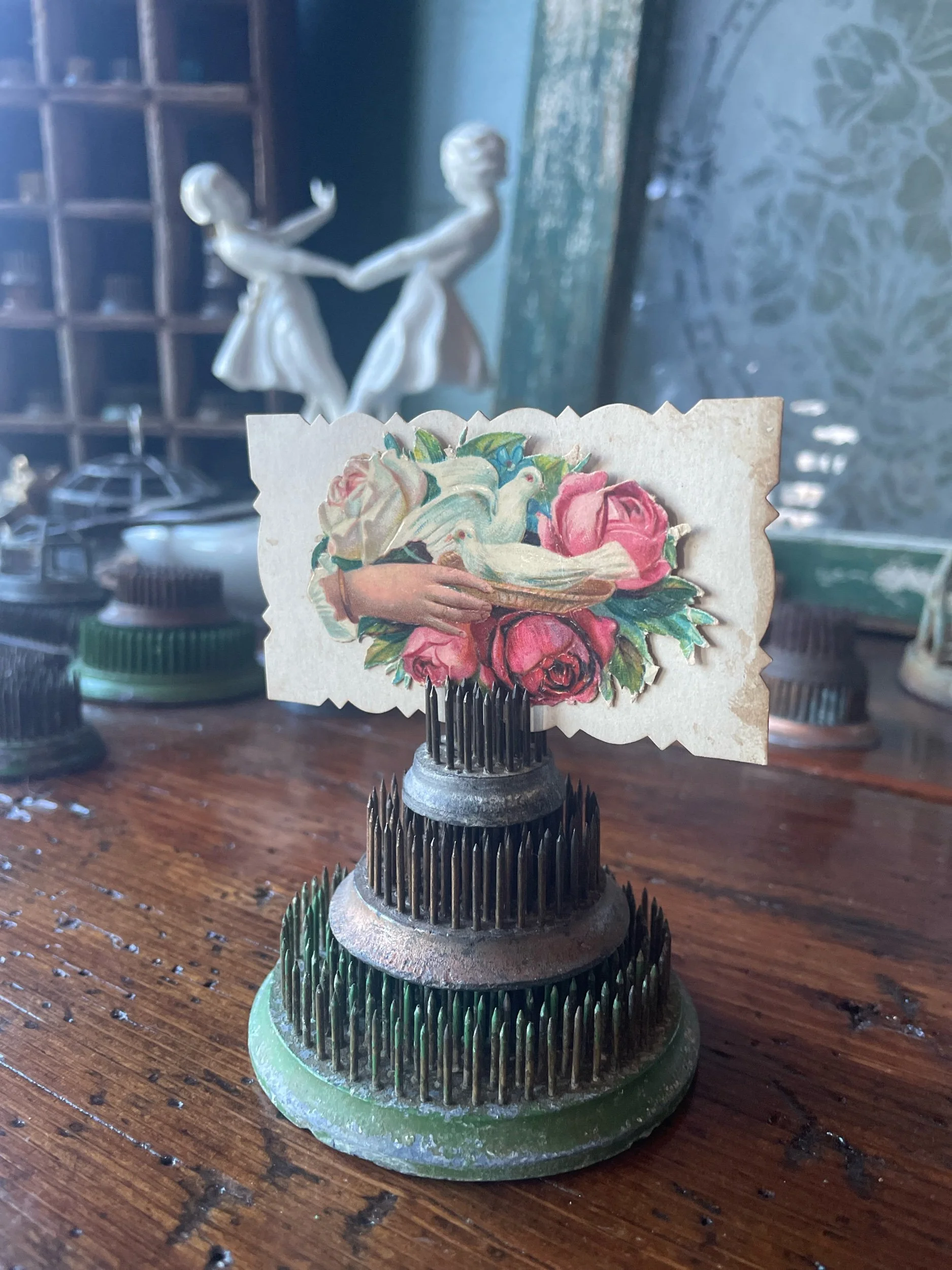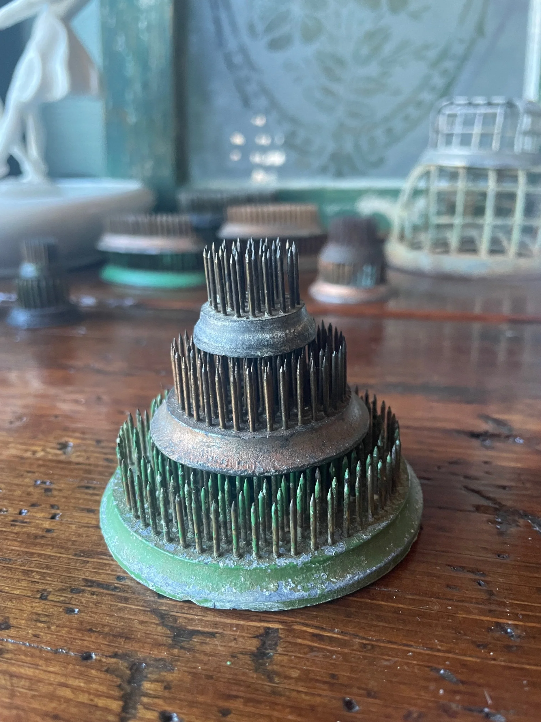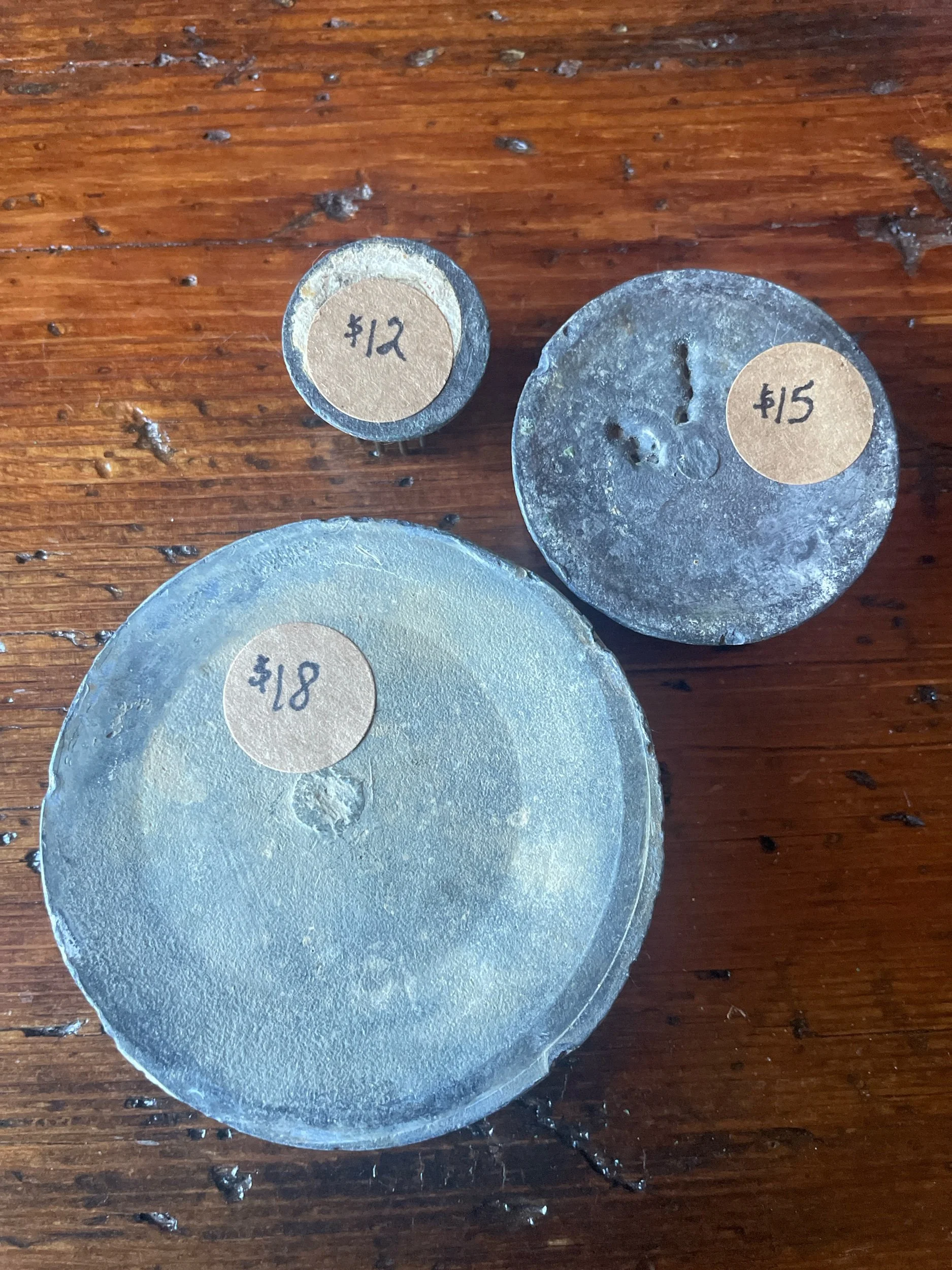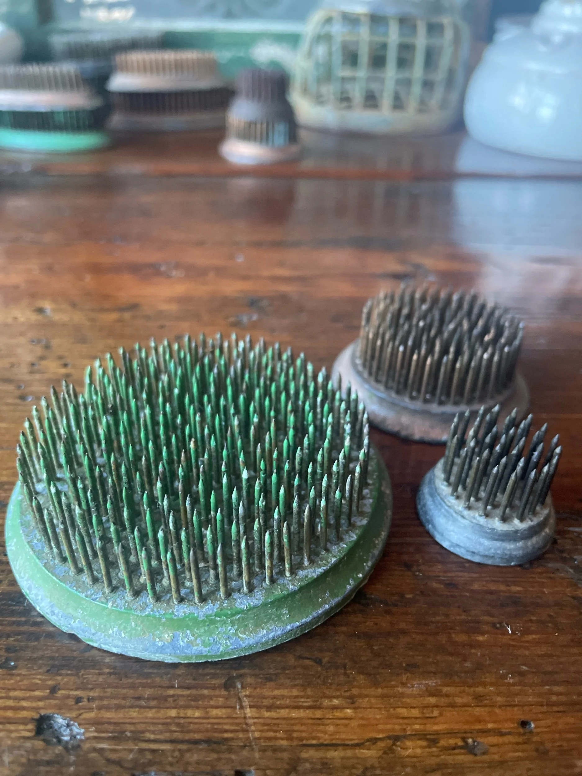 Three round pin-type floral frogs make a fun display but are equally useful for arranging flowers. They are 3”, 2”, and 1” in diameter and all .75” tall.